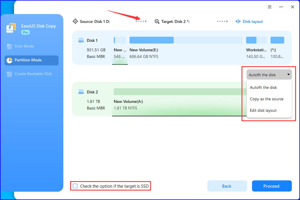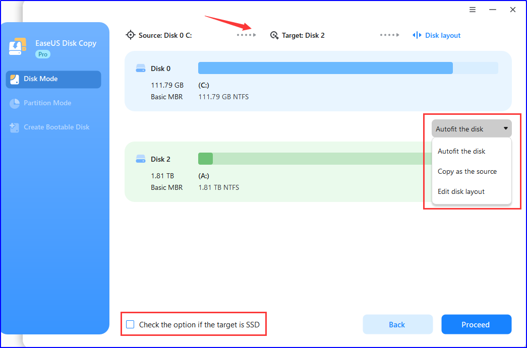 - “Autofit the disk” resize the layout on destination disk according to the size of it to make the disk as the best status.