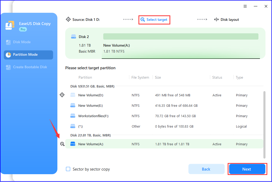 - Check the “Sector by sector copy” option if you need a sector level clone.