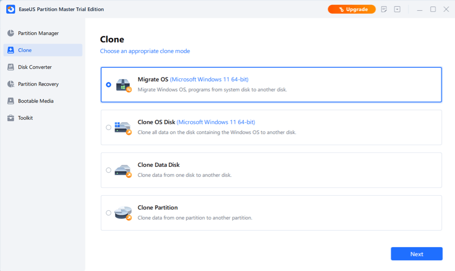 • Upgrade OS disk to an SSD for better computer performance or a larger hard drive to save more files without reinstalling Windows by cloning disk.