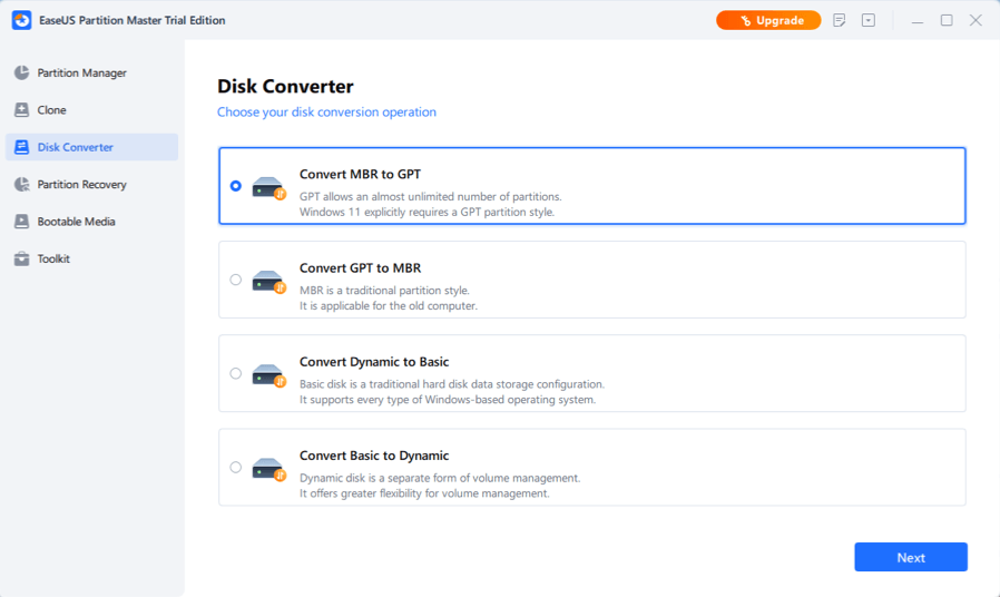 • Convert MBR to GPT and vice versa