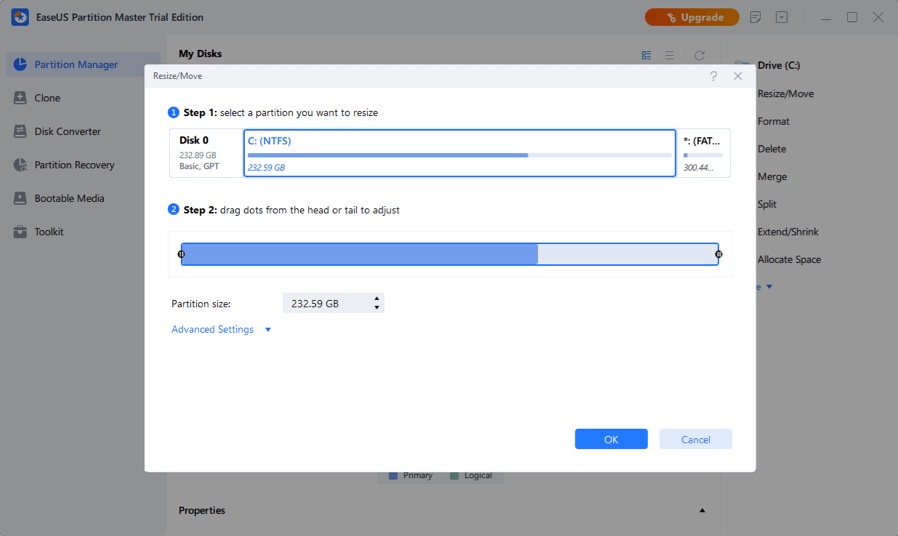 When C drive or other disk partition gets full and warns low disk space, you can efficiently extend it with unallocated & free space on a local drive by resizing, extending or merging partitions without rebooting.